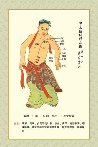 手太阴肺经十二经脉之一。它的循行路线是:在体内,属肺,络大肠,并与胃、喉相连。在体表,由胸部外上方沿上肢曲侧前面向下,止于得拇指端。木经有病时,主要有咳嗽,咳血、喘息气短、口渴,烦躁、胸满、肩背痛、手心发热、伤风、自汗小便频数、尿黄赤等症状和病症,以及在本经循行部位的局部症状。