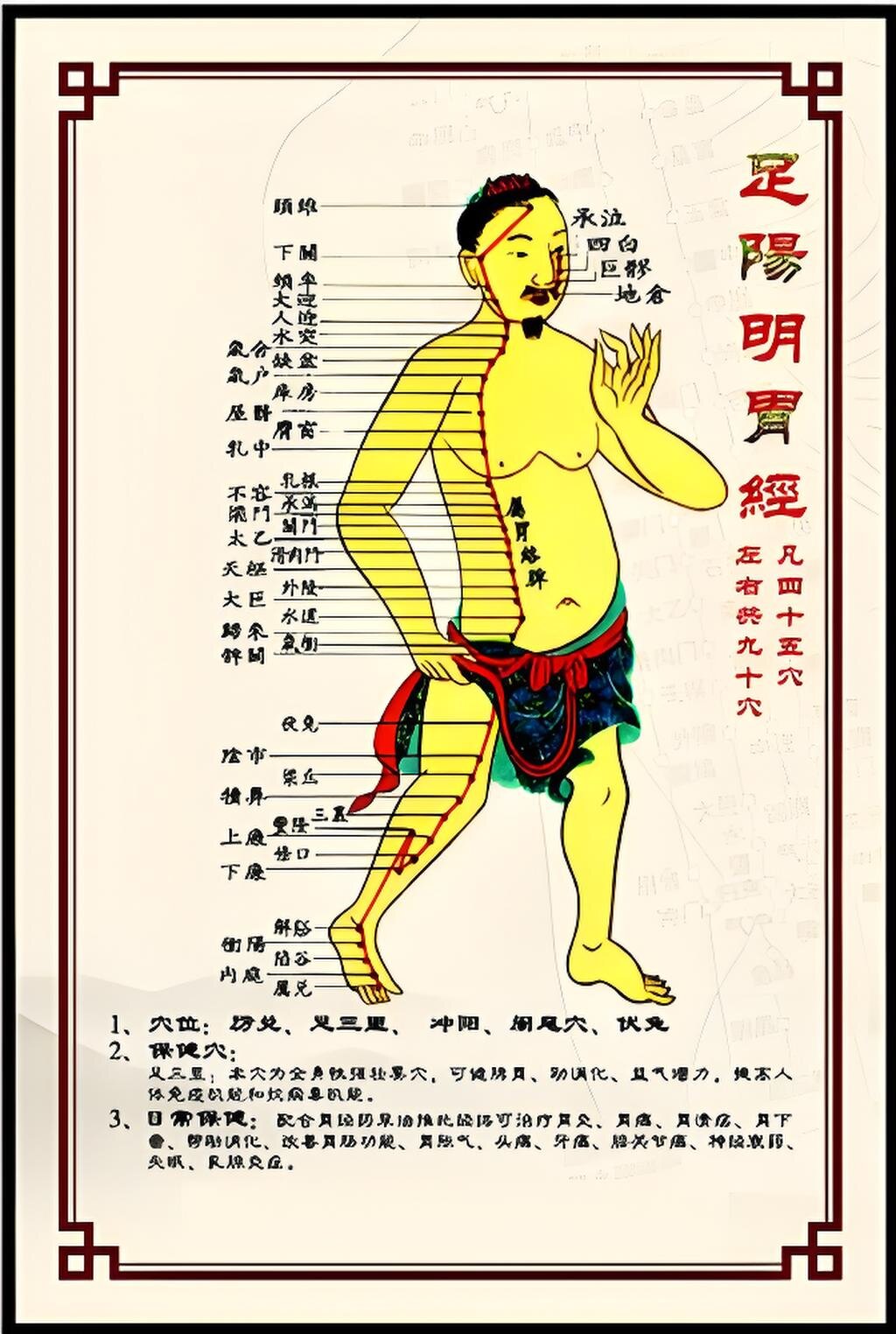 - 主要腧穴:本经一侧 45 穴,左右两侧共 90 穴,其中 15 穴分布于下肢的前外侧面,30 穴在腹、胸部与头面部。主要腧穴有承泣、四白、巨髎、地仓、大迎、颊车、下关、头维、人迎、水突、气舍、缺盆、气户、库房、屋翳、膺窗、乳中、乳根、不容、承满、梁门、关门、太乙、滑肉门、天枢、外陵、大巨、水道、归来、气冲、髀关、伏兔、阴市、梁丘、犊鼻、足三里、上巨虚、条口、下巨虚、丰隆、解溪、冲阳、陷谷、内庭、厉兑。