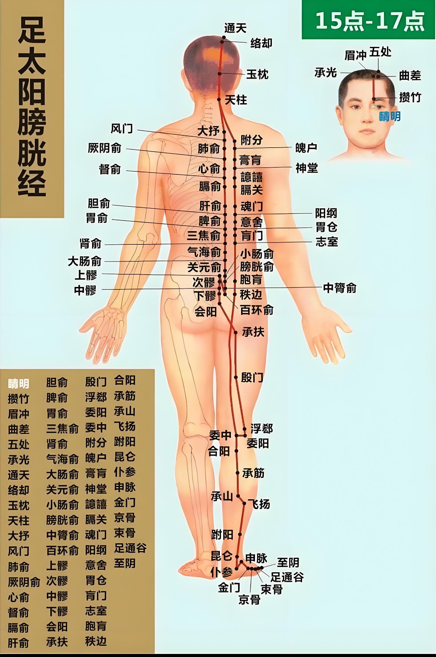- 下肢部分:继续沿着脊柱下行,经过臀部,进入大腿后侧。在大腿后侧分为两支,一支沿着大腿后侧中线向下,经过腘窝到达小腿后侧;另一支则沿着大腿后侧的外侧向下行走。这两支脉都汇聚到足小趾外侧端的至阴穴,完成整个经脉的循行路线。