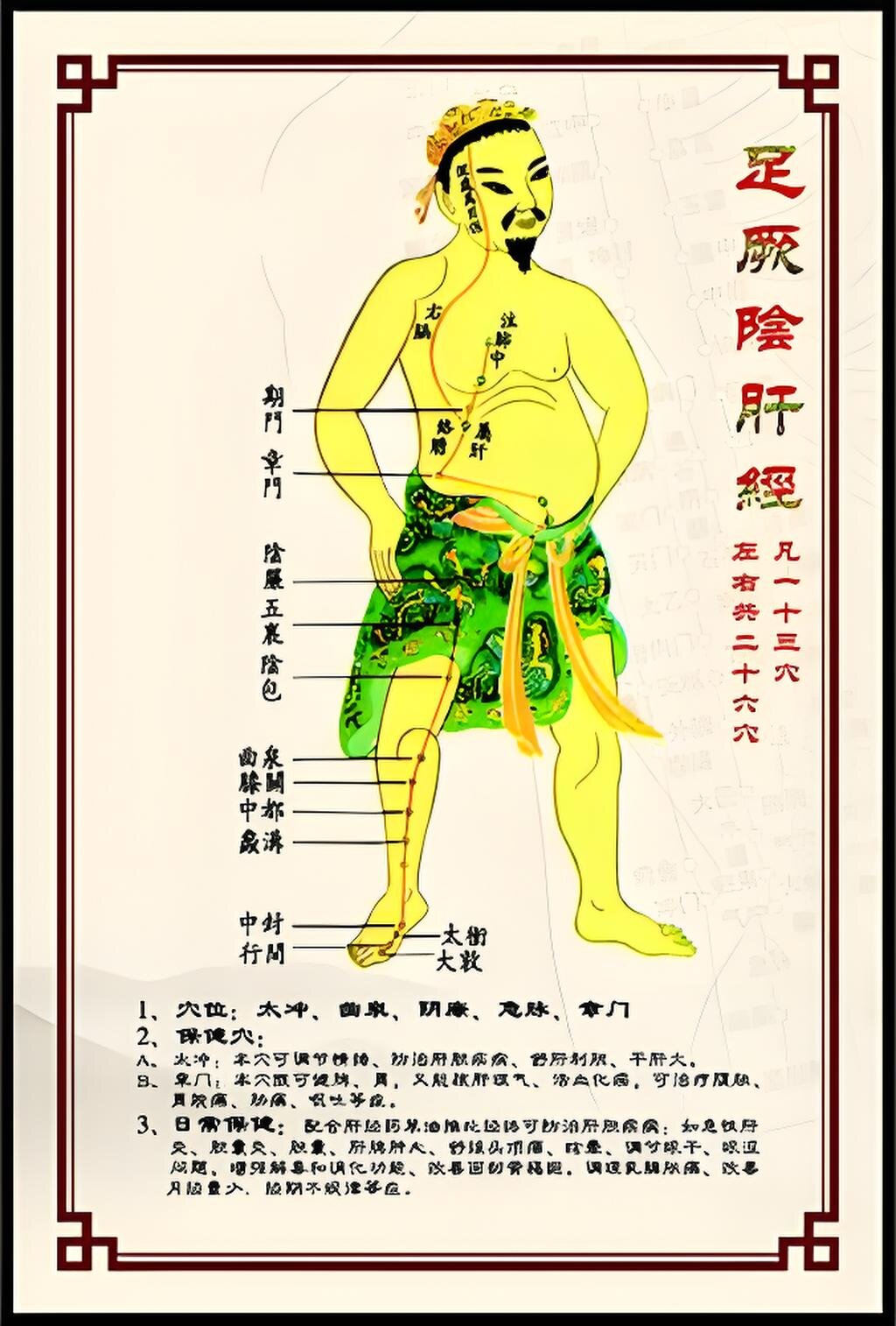 - 再沿大腿内侧向上,环绕生殖器区域,上行抵达小腹,属于肝,络于胆。