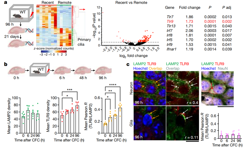 通过在不同时间点对这些小鼠的神经元进行分析,研究者们发现,电击经历在小鼠大脑留下记忆的过程中,Toll样受体9(TLR9)通路相关基因在神经元被强烈激活,TLR9表达显著上调。