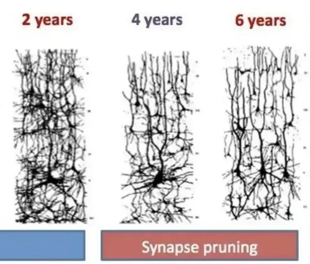 虽然在 14 周的时候,我们会诞生数量最多的神经元,但神经元质量参差不齐。人脑的空间就只有 1400ml 左右,你让 10 个低质量的神经元建立 1 万个神经连接,可能还不如一个神经元建立 5000 个神经连接更加的节能高效。