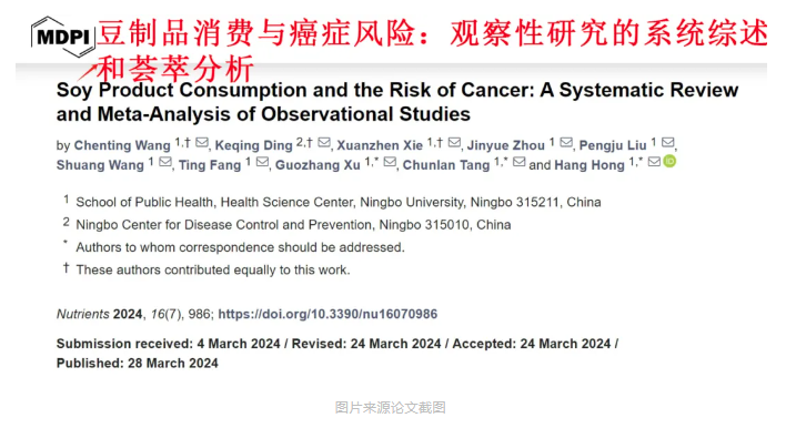 近期,宁波大学和宁波市疾控中心的研究团队在国际学术期刊《营养素》上发表了一项关于大豆制品消费与癌症风险关系的观察性研究。