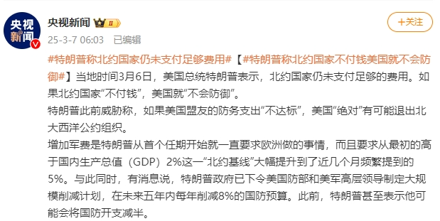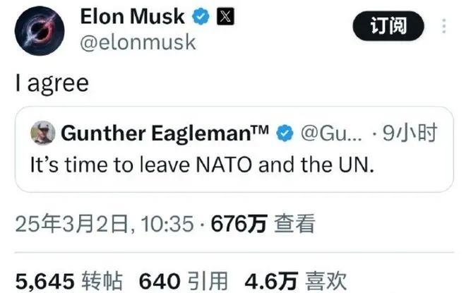 前几天,外界流传着“特朗普可能要宣布退出北约”的说法,这件事也不是凭空出现,因为特朗普在前段时间说,如果其他北约成员国的国防支出不达标,美国绝对可能退出北约。前几天,外界流传着“特朗普可能要宣布退出北约”的说法,这件事也不是凭空出现,因为特朗普在前段时间说,如果其他北约成员国的国防支出不达标,美国绝对可能退出北约。昨天3月6日,特朗普再次表示,北约国家仍未支付足够的费用,如果北约成员国不付钱,美国就不会防御。与此同时,有网友在X平台上发帖称“是时候退出北约和联合国了”,马斯克转发了该帖子并评论说:“我同意。”一进步印证大家的猜测,特朗普是不是真的要让美国退出北约?一方面是乌克兰做梦都想加入北约,甚至不惜与俄罗斯死战,一方面是北约的老大美国,却整天想着如何退出北约?