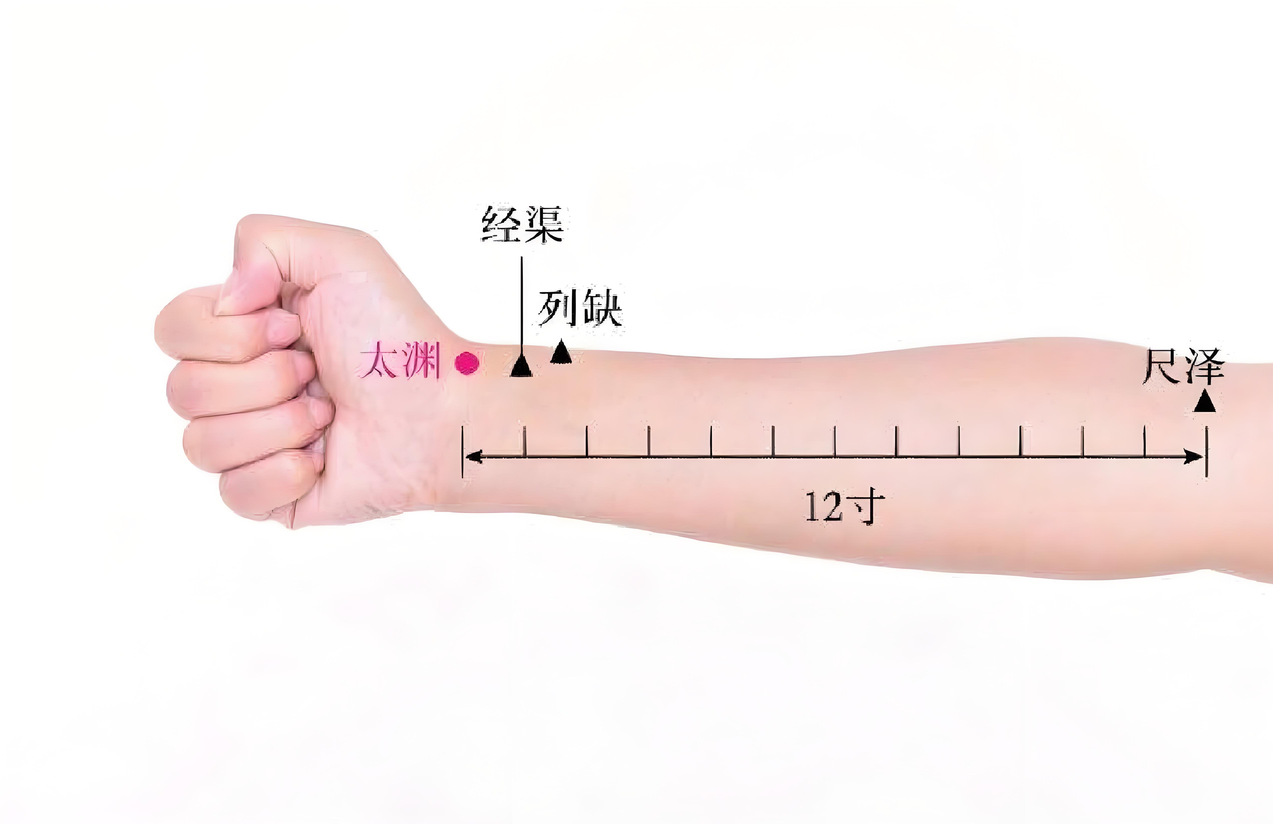 腕横纹至肘横纹=12寸,太渊穴位于腕横纹桡侧端。