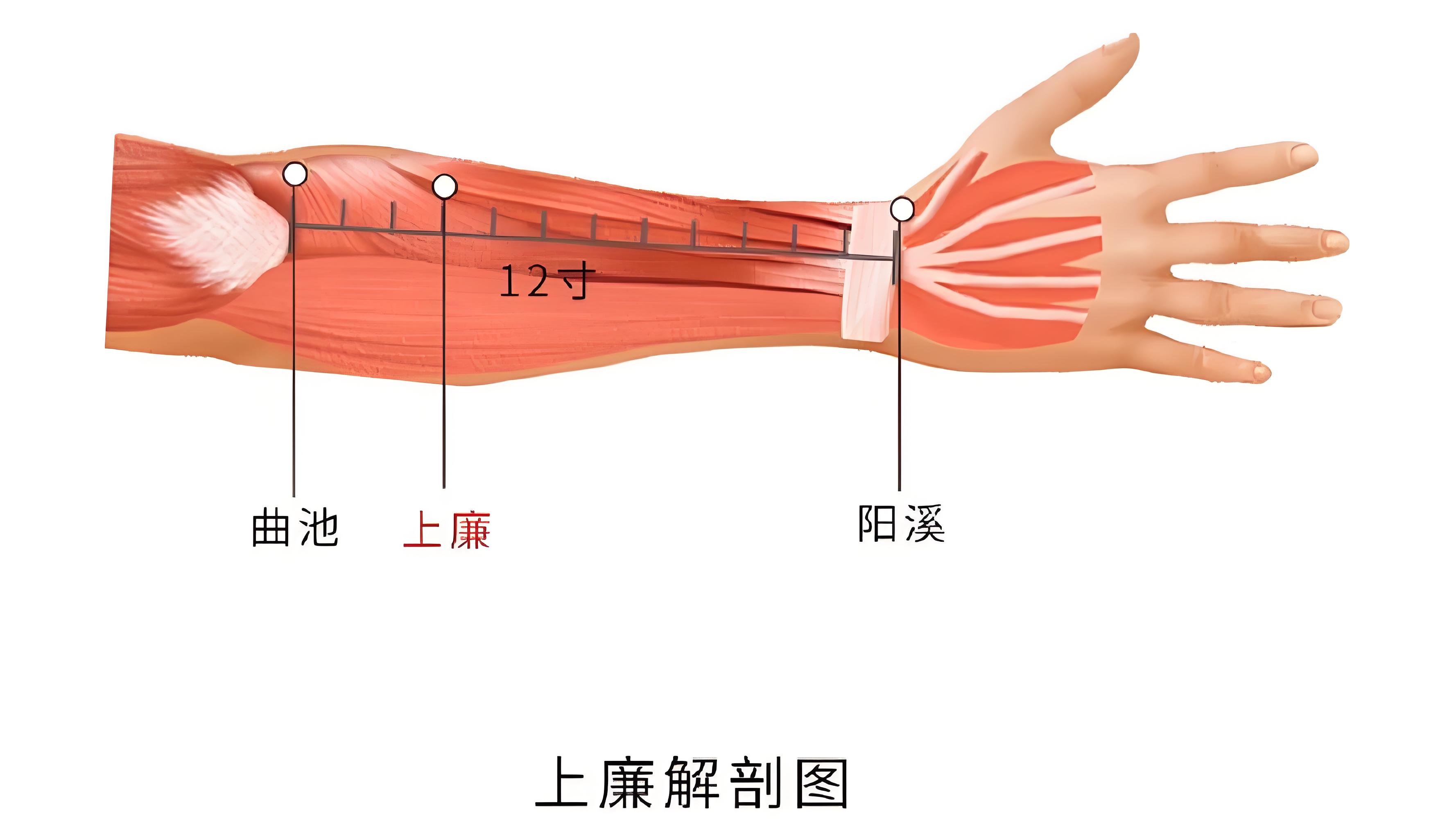 肘横纹至腕横纹=12寸,上廉穴位于肘横纹下3寸(前臂上段)。