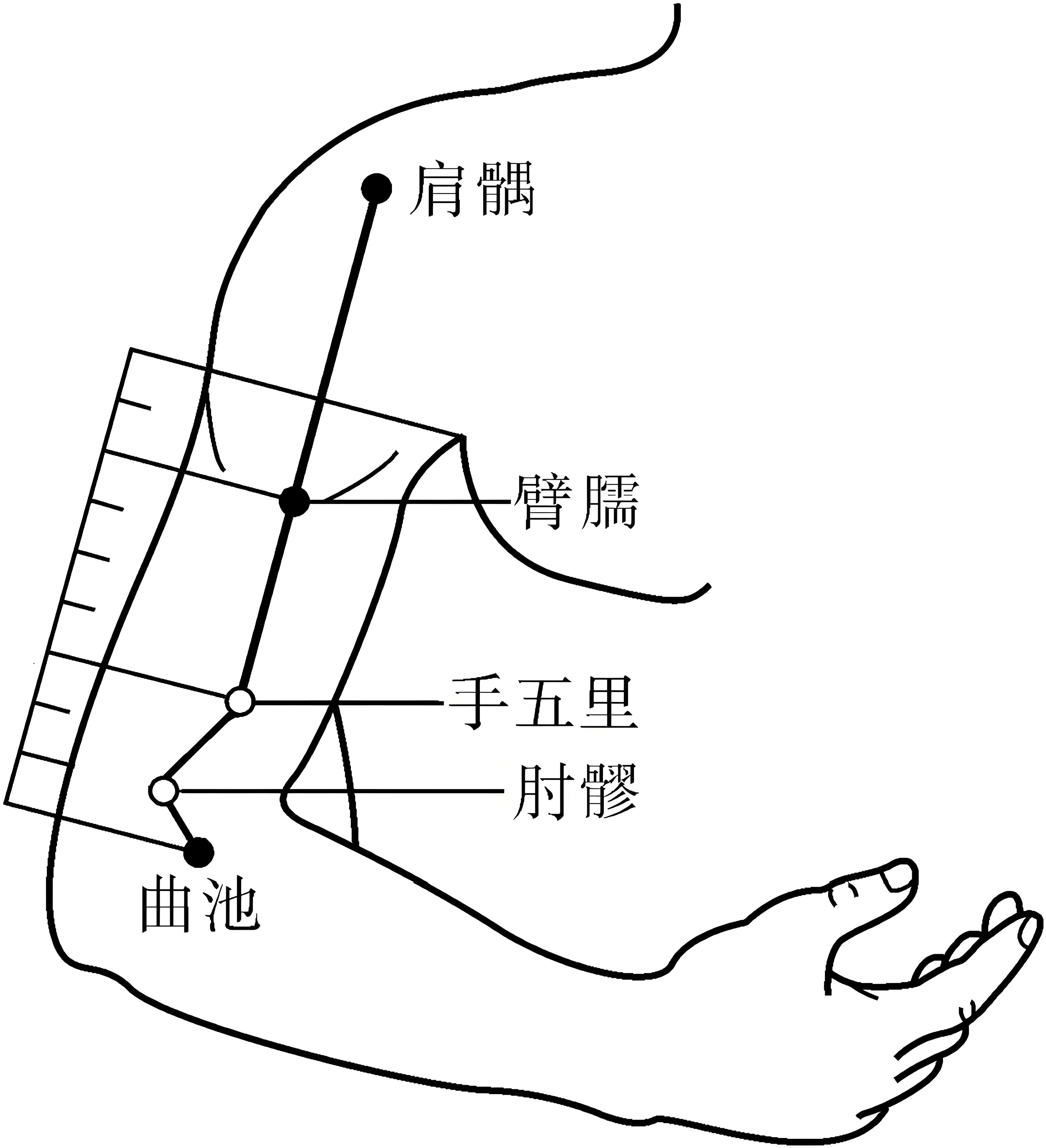 位于上臂外侧,曲池穴(肘横纹外侧端)与肩髃穴(肩峰前下方凹陷)连线上,曲池穴上7寸(约9横指)处。体表标志: