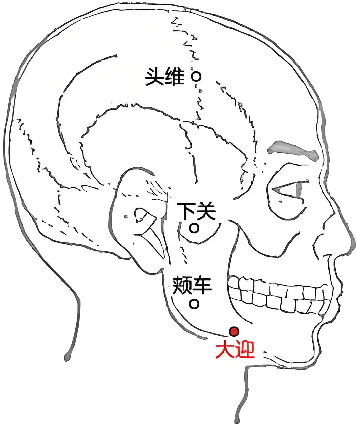 大迎穴(ST5) 是足阳明胃经的重要穴位,以治疗面颊、下颌及口腔疾病为特色,具有疏风通络、消肿止痛的功效。以下为详细表述: