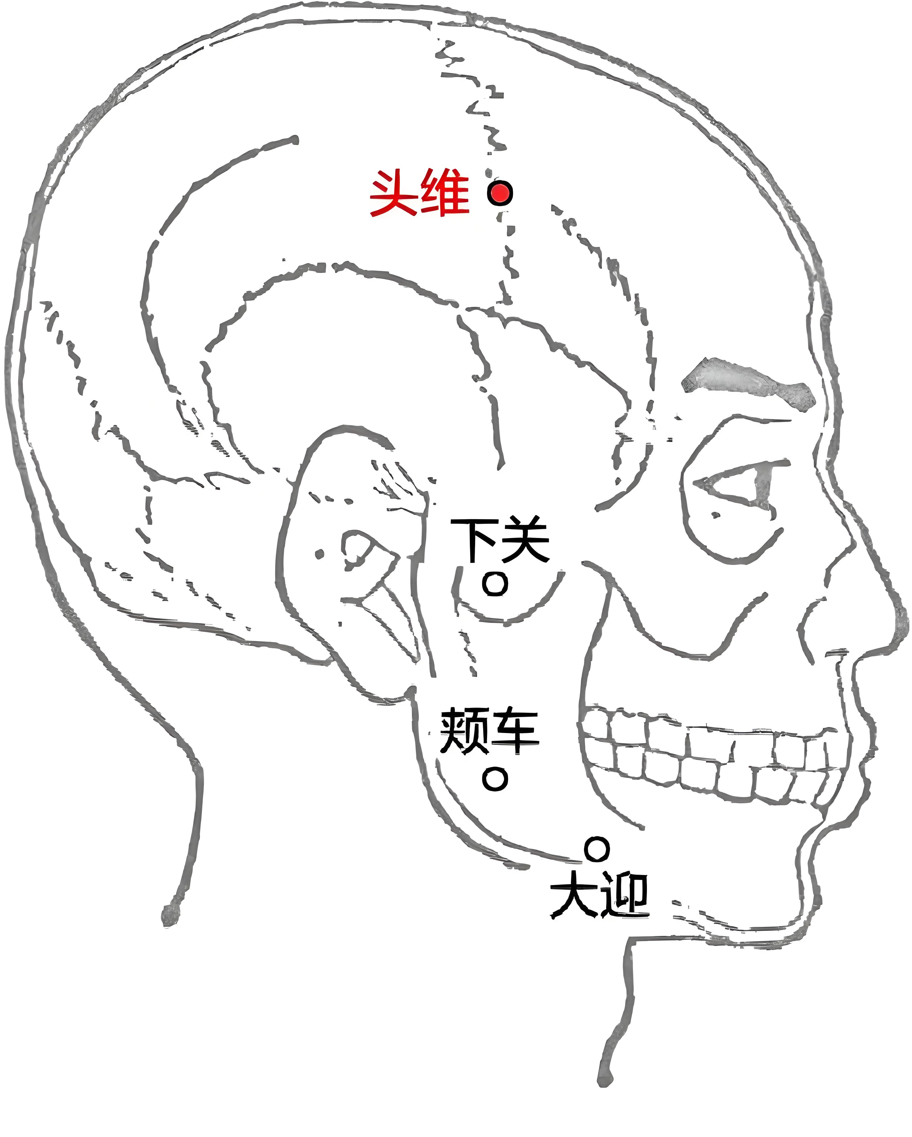 面瘫口歪:头维 + 地仓(胃经) + 颊车(胃经) → 通络牵正。