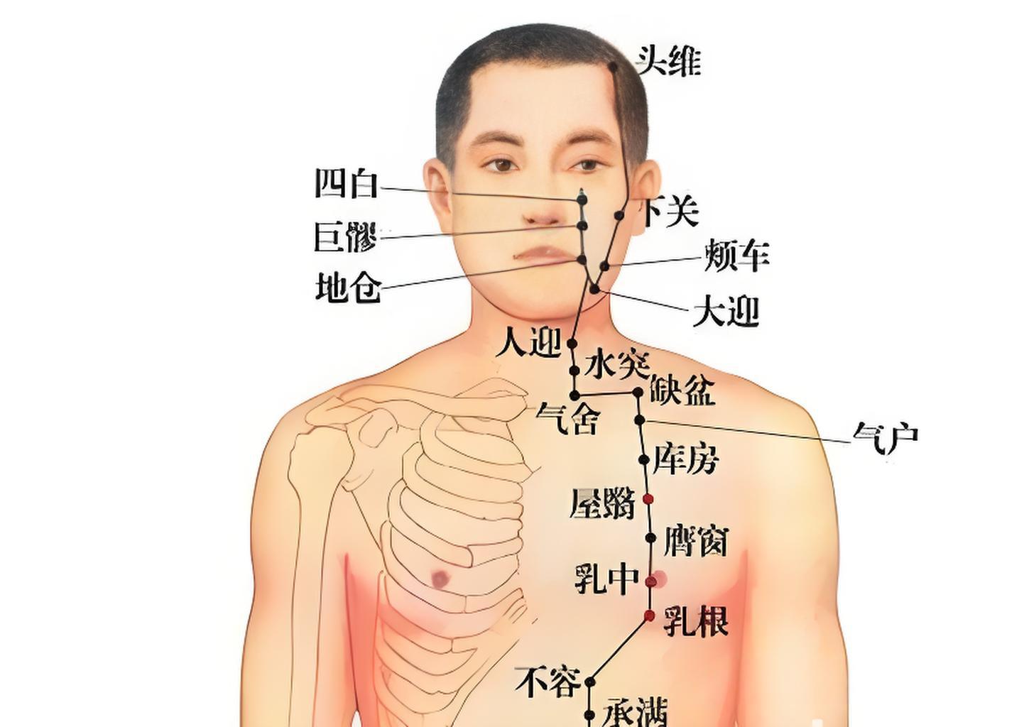 足阳明胃经“从缺盆下乳内廉”,屋翳穴位于胃经循行胸部的重要节点,调节胃经气血上承乳房及胸肺。