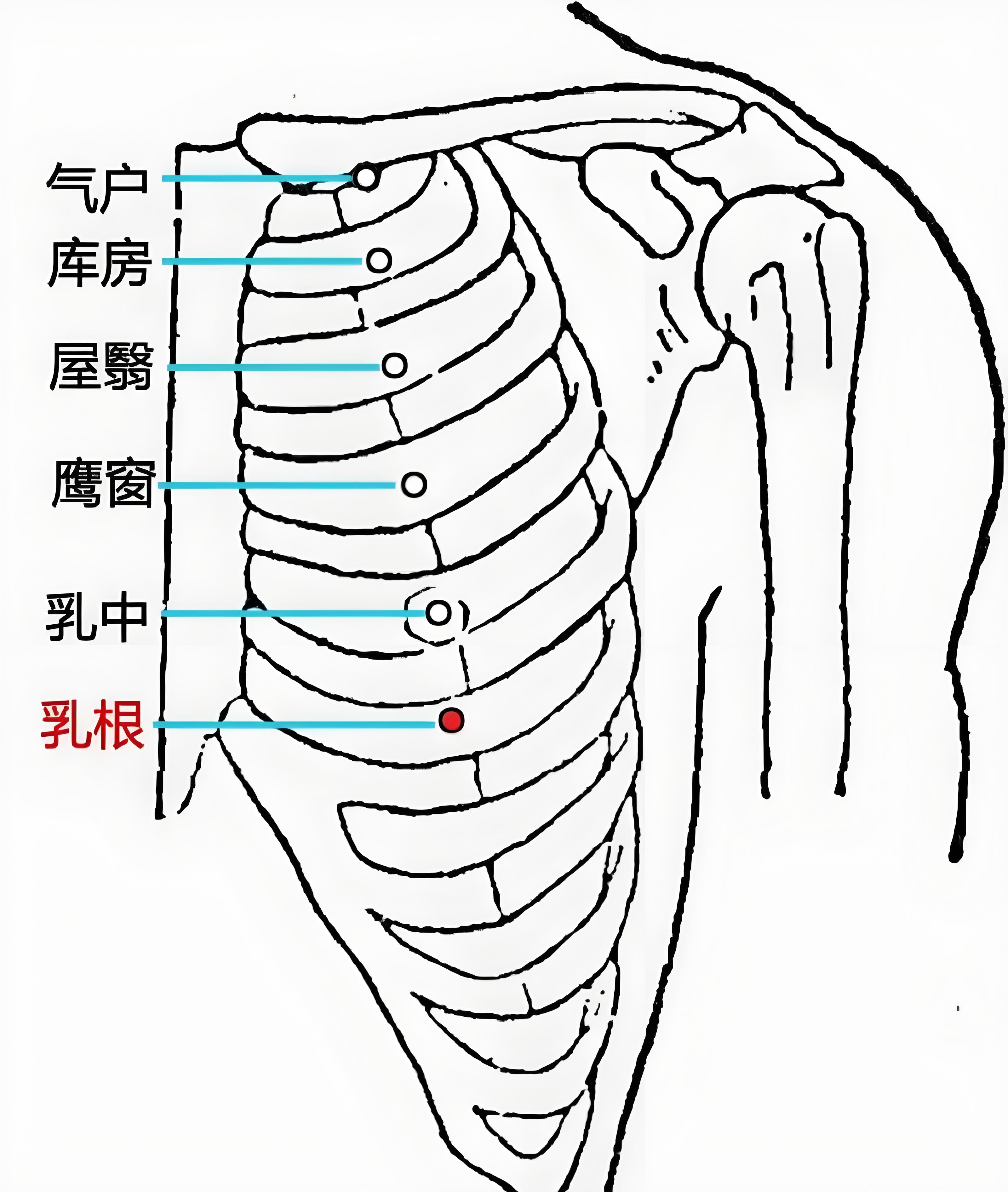 足阳明胃经“下乳内廉”,乳根穴为胃经气血灌注乳房的枢纽,调节乳汁化生与输布。