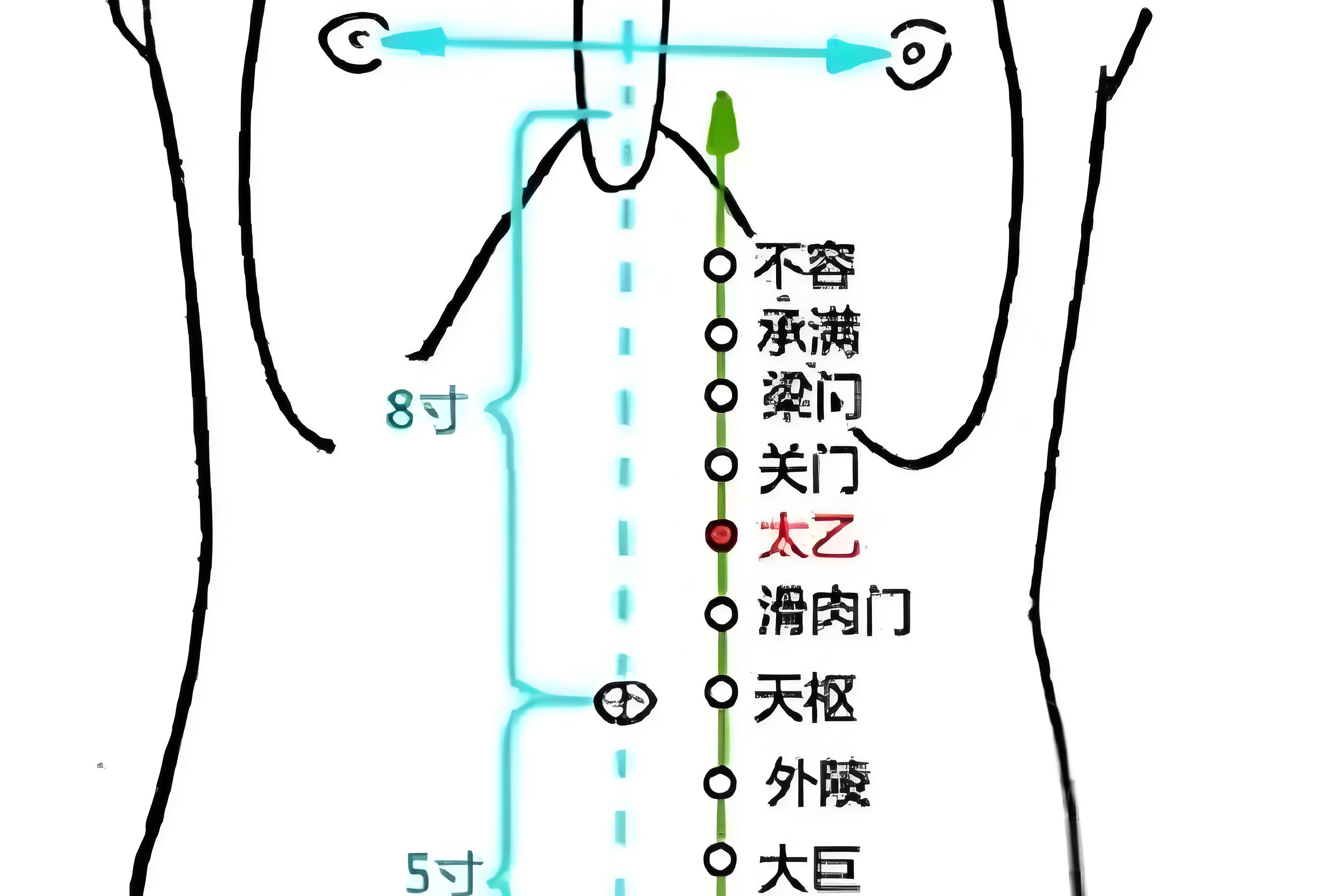 足阳明胃经“属胃,络脾”,太乙穴位于胃经腹部循行线,调和脾胃气机,兼通任脉气血。
