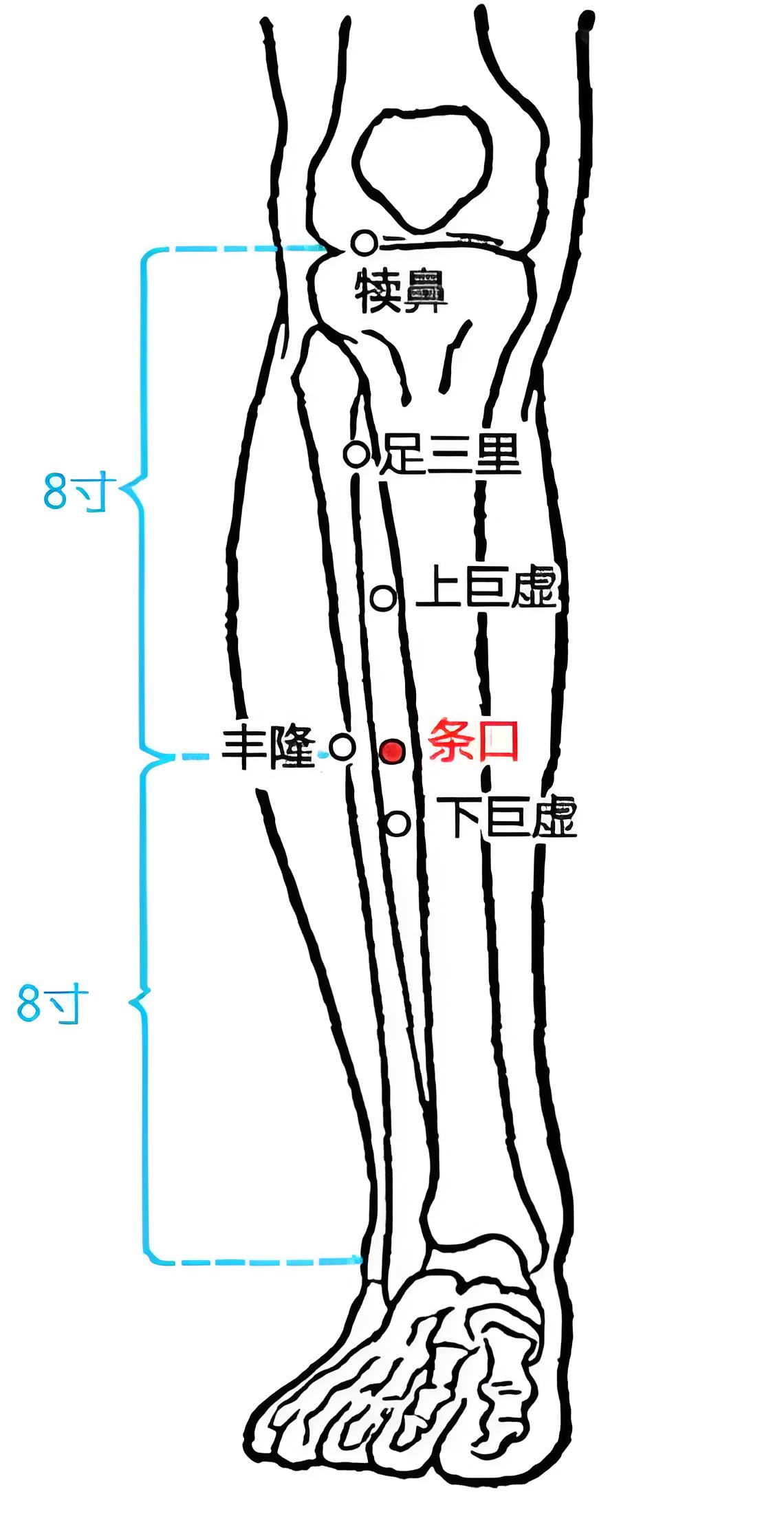 《针灸甲乙经》:“条口,在膝下八寸,足阳明脉气所发。”