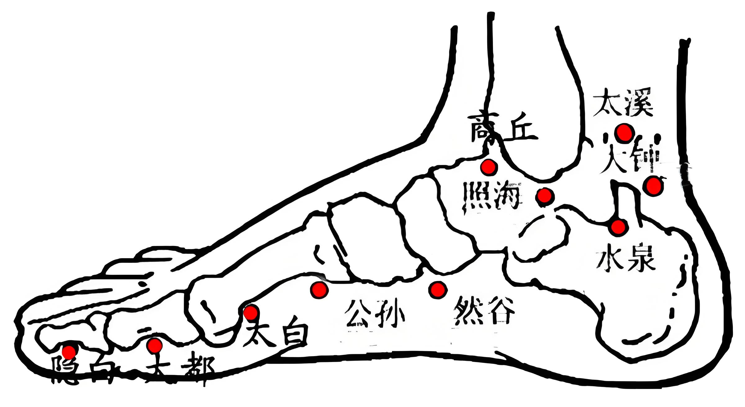 商丘 + 阴陵泉(脾经):清热利湿,改善黄疸、带下病。
