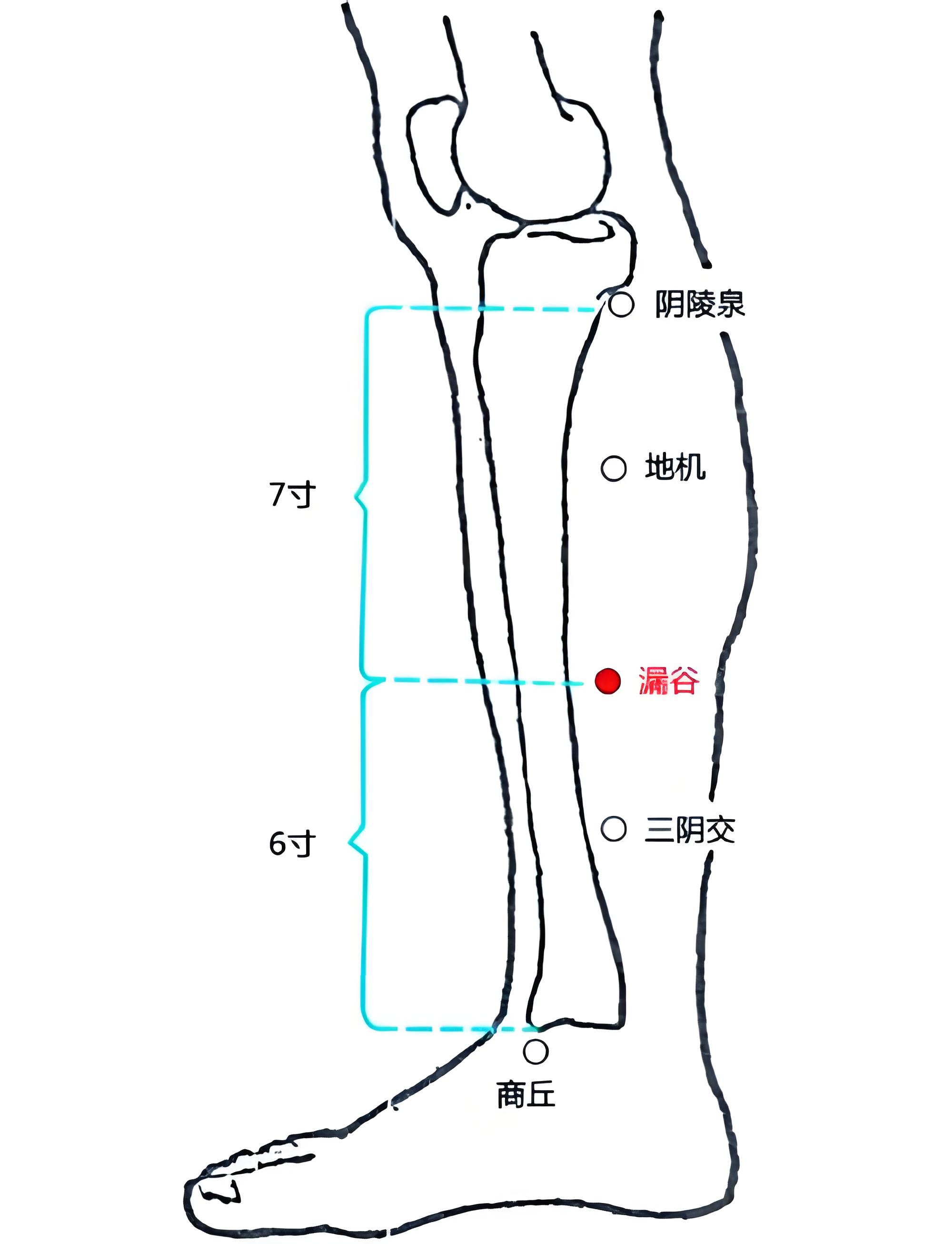 简便取穴法:先定位三阴交(内踝尖上3寸),再向上量3寸,按压胫骨后缘的凹陷即为漏谷穴。