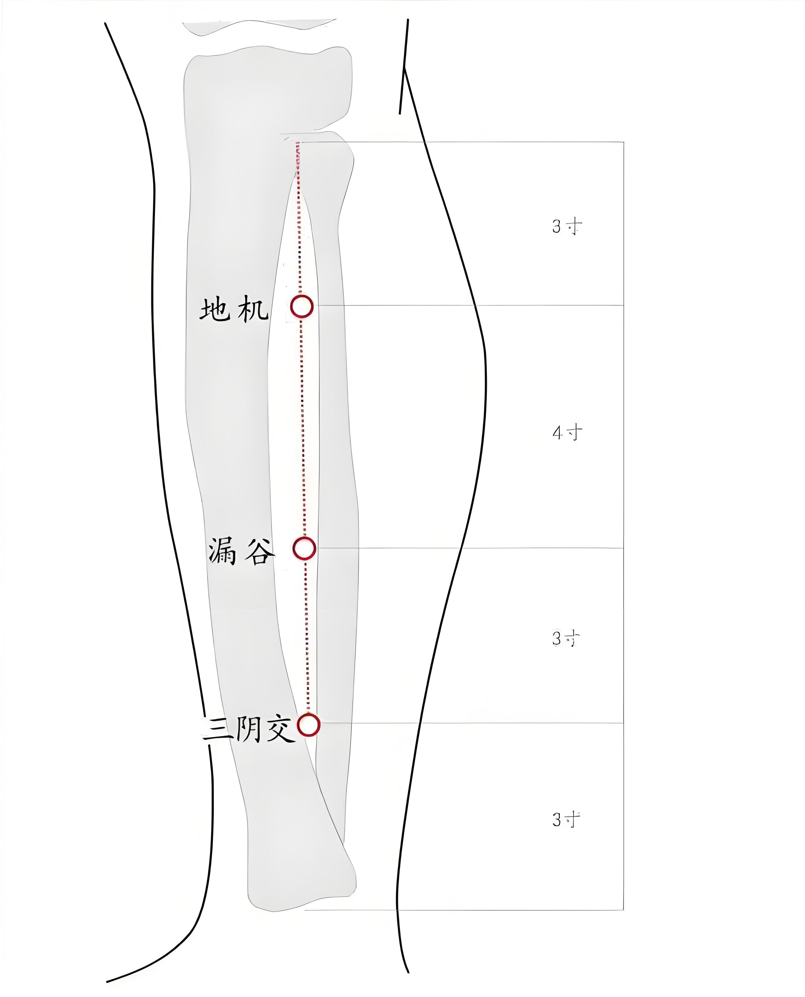 位于小腿内侧,内踝尖与阴陵泉穴的连线上,阴陵泉下3寸(约四横指宽度),胫骨内侧缘后际。