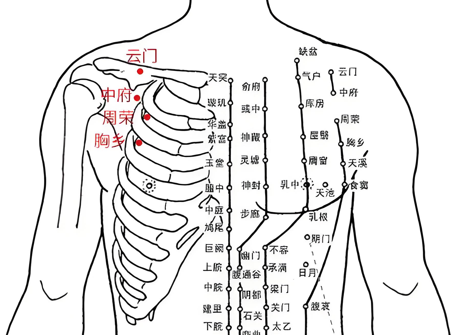体表定位:仰卧位或正坐时,锁骨外端下方,第二肋间隙处向外旁开6寸,按压胸大肌外侧凹陷处。