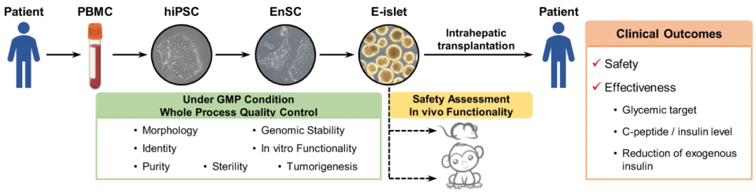 殷浩教授介绍,相关科研团队历经十余年潜心研究,利用患者血液外周血单个核细胞重编程为自体诱导性多能干细胞,并使用国际首创技术使之转变为“种子细胞”,即内胚层干细胞,最终实现在体外再造胰岛组织(E-islet)。该项技术已趋于成熟,是再生医学治疗糖尿病领域的重大突破(图1)。