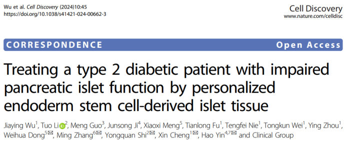 4月30日,海军军医大学第二附属医院(上海长征医院)殷浩教授团队联合中国科学院分子细胞科学卓越创新中心程新教授团队,在Cell Discovery发表了题为“Treating a type 2 diabetic patient with impaired pancreatic islet function by personalized endoderm stem cell-derived islet tissue”的研究成果。这是国际上首次利用干细胞来源的自体再生胰岛移植,成功治愈胰岛功能严重受损糖尿病的病例报道。目前该患者已彻底脱离胰岛素长达33个月。